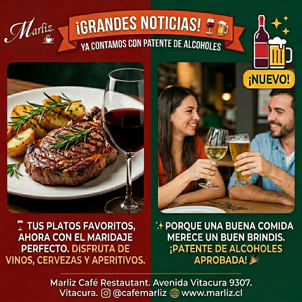 En Marliz Café Restaurant ya contamos con patente de alcoholes, por lo que ahora puedes acompañar tus platos favoritos con una copa de vino, un aperitivo o una cerveza bien helada.